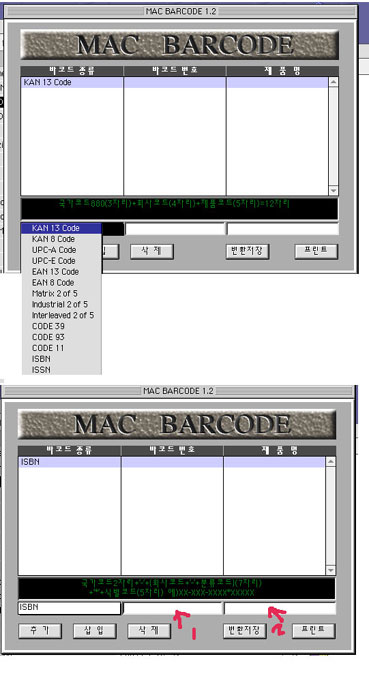 1번은 국가번호, 회사번호, 상품번호(맞을거예요 제기억으론.) 2번은 제품이름(아무거나...)